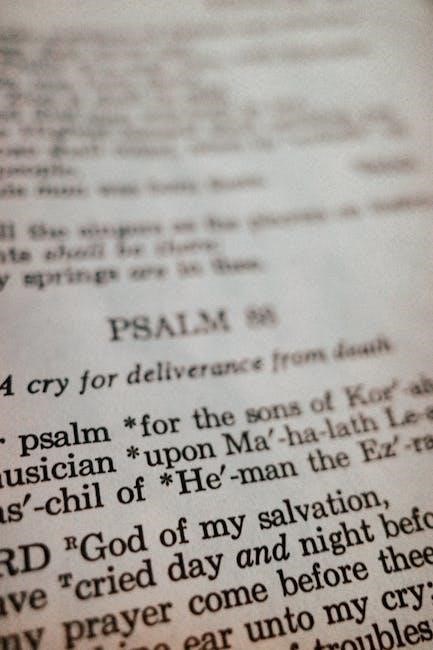 Exploring these thematic divisions through digital texts enhances comprehension and appreciation of the Psalms’ literary richness; The ability to cross-reference within a PDF reveals recurring motifs and theological connections, deepening one’s understanding of this foundational biblical text.